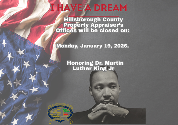 Hillsborough County Property Appraiser Offices will be closed on Monday, January 19, 2026 in observance of Martin Luther King Jr. Day. Visit us online, anytime at www.hcpafl.org.